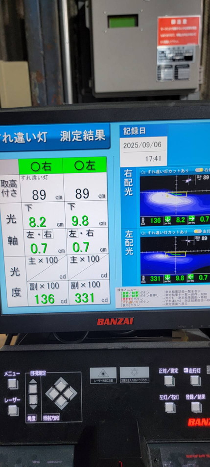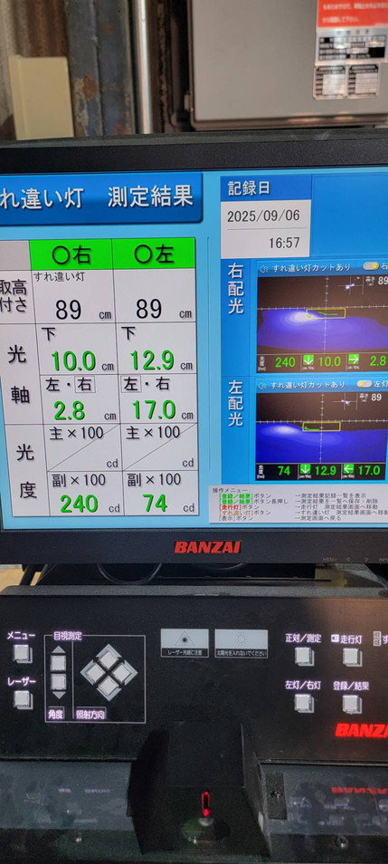 ヘッドライトの光軸をテスターで測定し、調整を行いました。