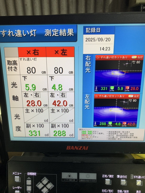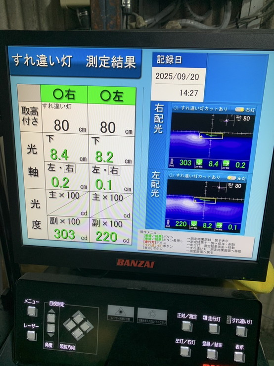 ヘッドライトの光軸をテスターで測定し、調整を行いました。