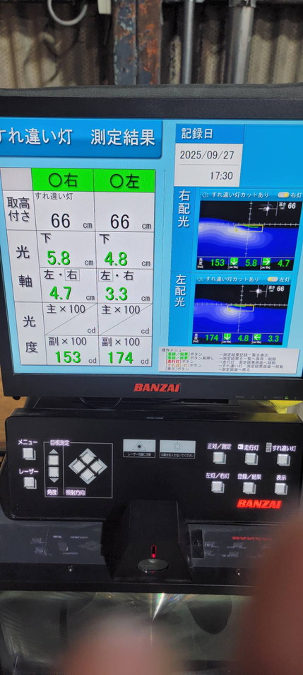 ヘッドライトの光軸をテスターで測定し、調整を行いました。