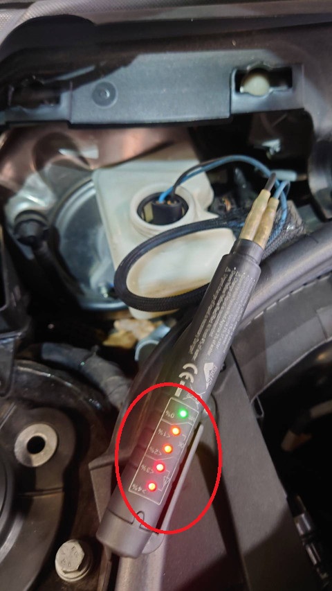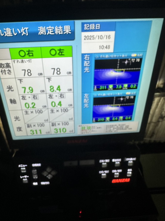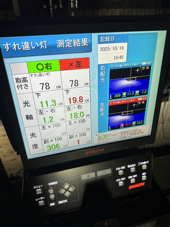 ヘッドライトの光軸をテスターで測定し、調整を行いました。