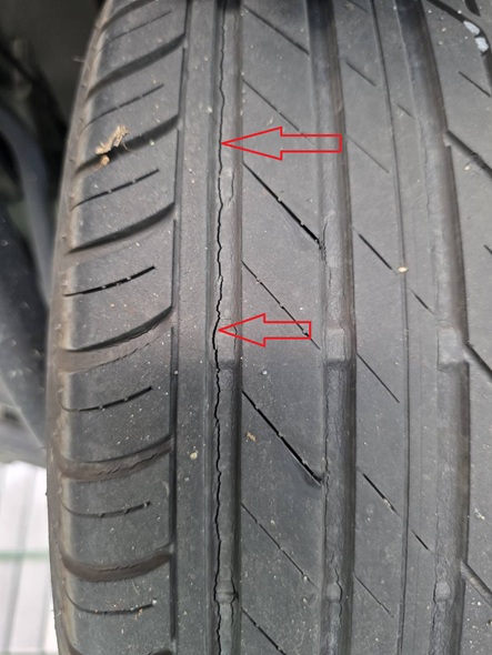 トレッドの間にひび割れがあり走行中にバーストの危険性がありますのでご相談の上、交換を致しました。