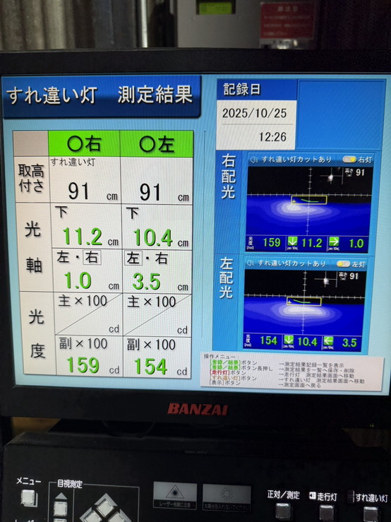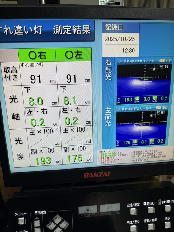 ヘッドライトの光軸をテスターで測定し、調整を行いました。
