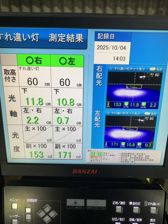 ヘッドライトの光軸をテスターで測定し、調整を行いました。