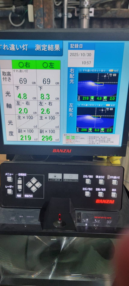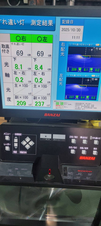 ヘッドライトの光軸をテスターで測定し、調整を行いました。
