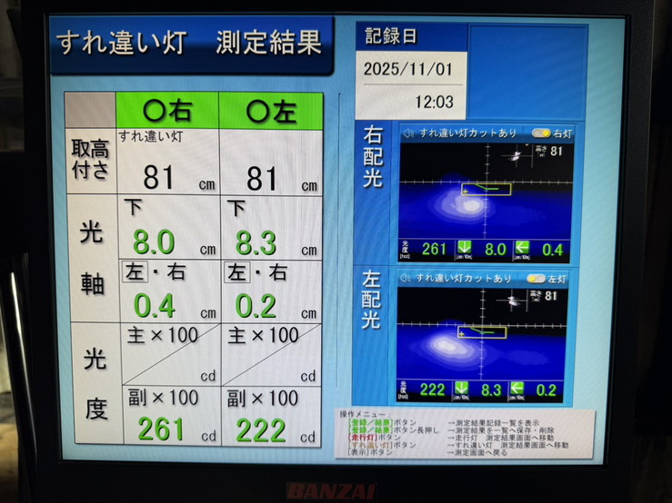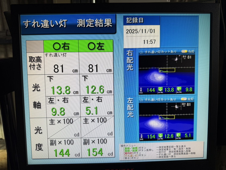 ヘッドライトの光軸をテスターで測定し、調整を行いました。
