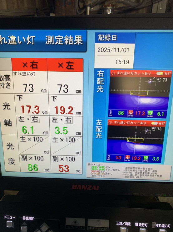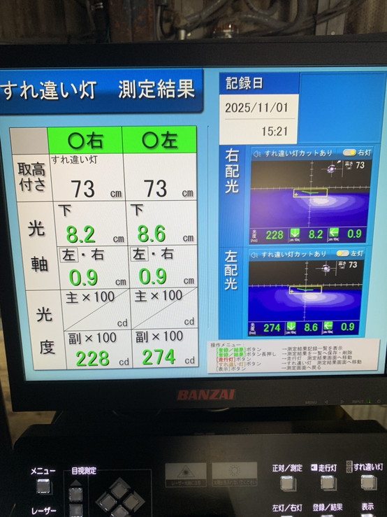 ヘッドライトの光軸をテスターで測定し、調整を行いました。