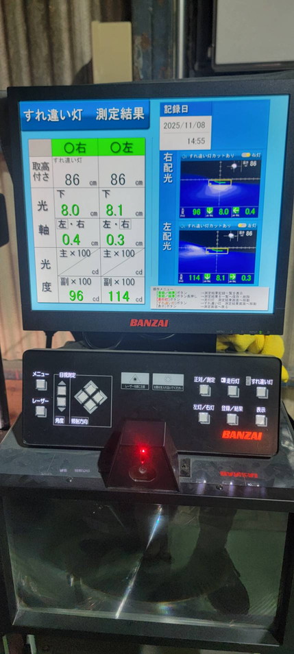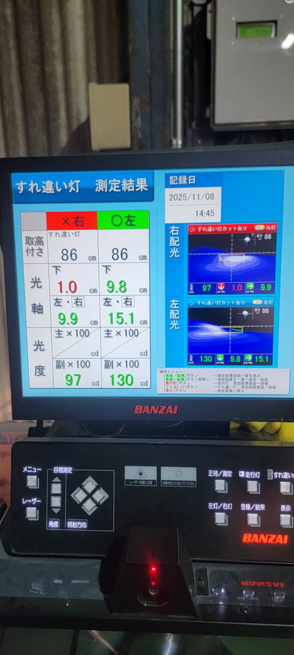 ヘッドライトの光軸をテスターで測定し、調整を行いました。