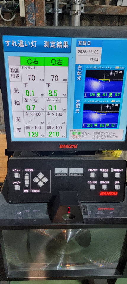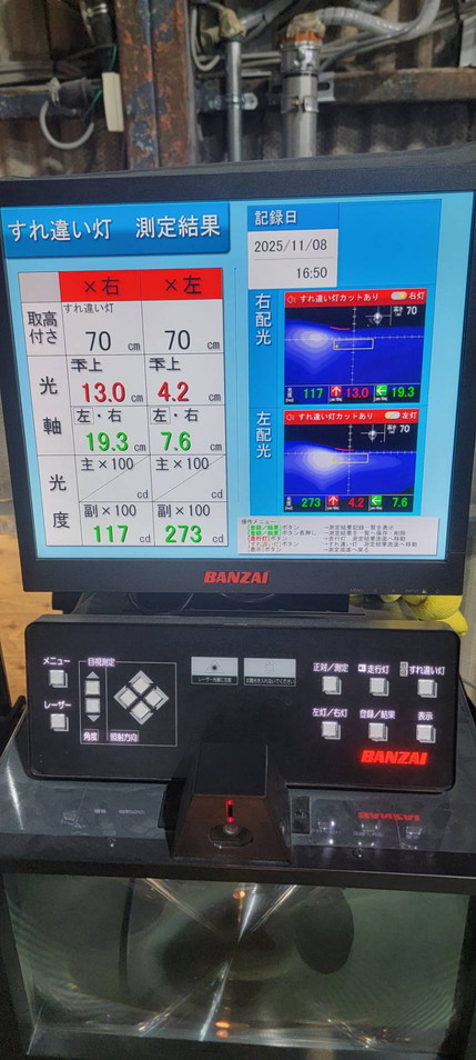 ヘッドライトの光軸をテスターで測定し、調整を行いました。