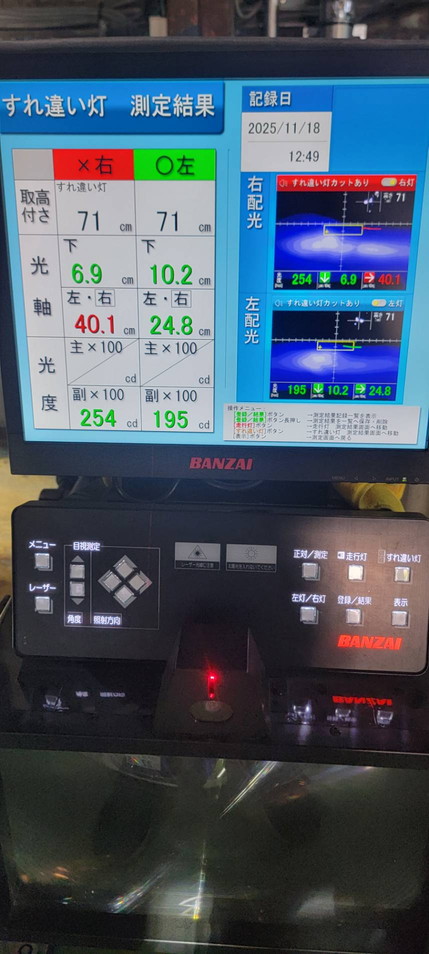 ヘッドライトの光軸をテスターで測定し、調整を行いました。