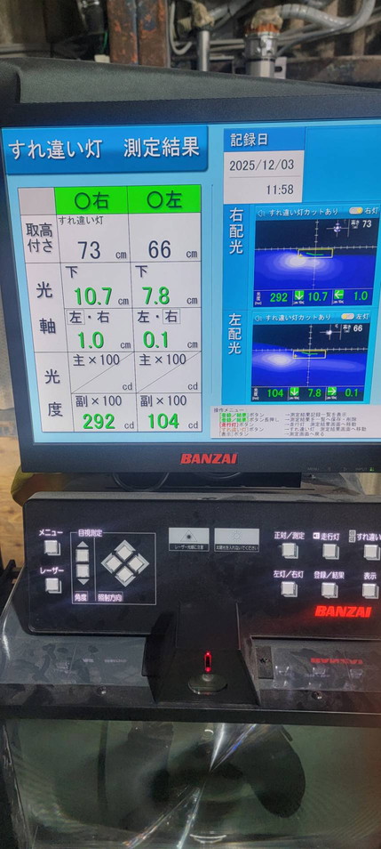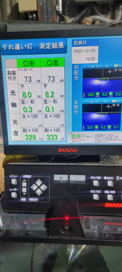 ヘッドライトの光軸をテスターで測定し、調整を行いました。