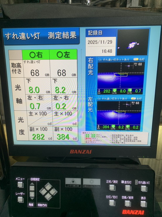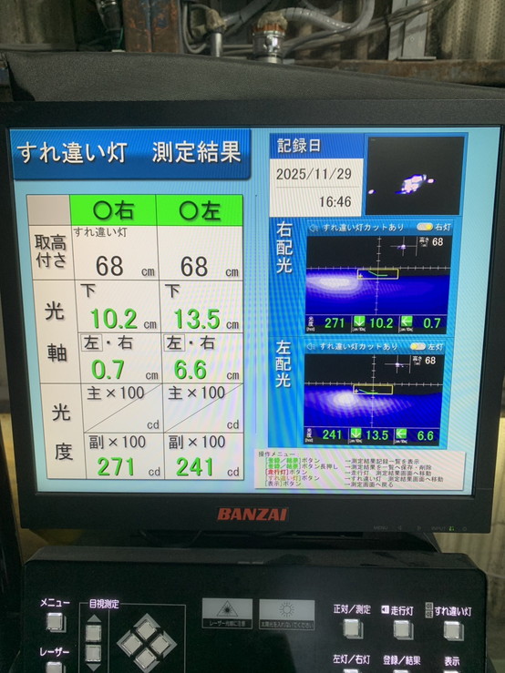 ヘッドライトの光軸をテスターで測定し、調整を行いました。