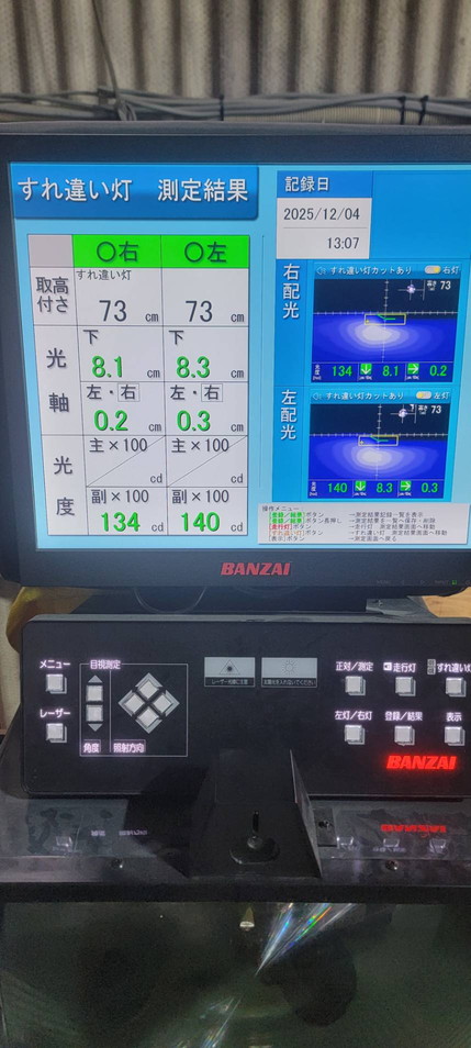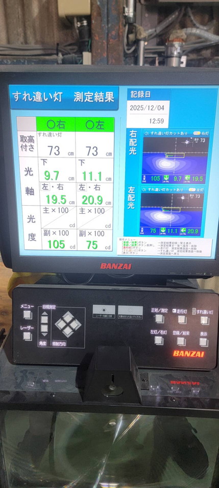 ヘッドライトの光軸をテスターで測定し、調整を行いました。