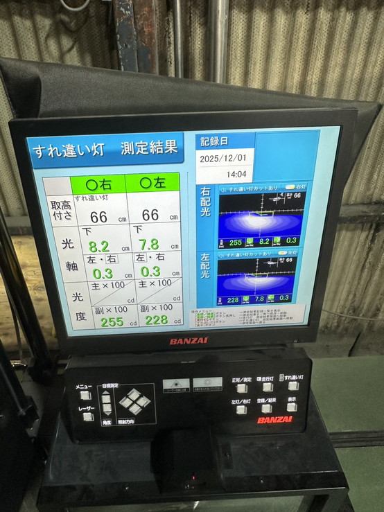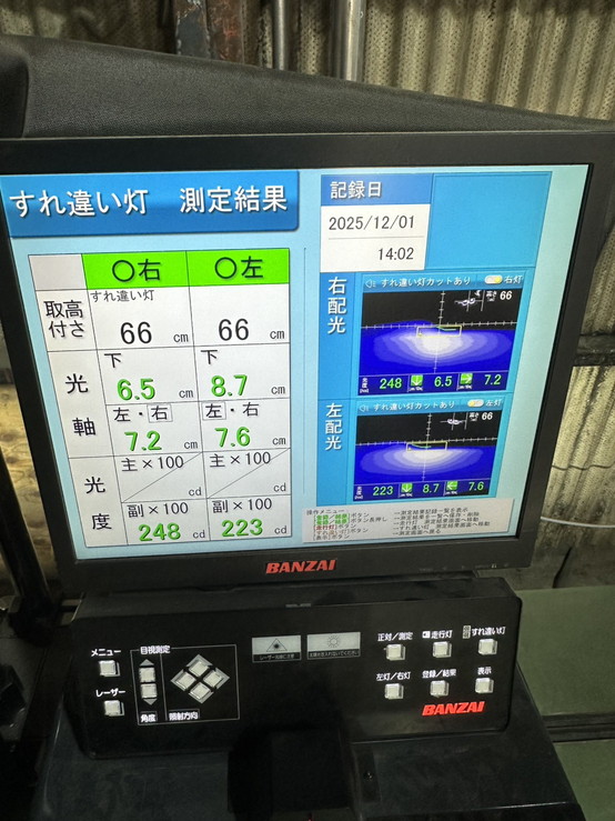 ヘッドライトの光軸をテスターで測定し、調整を行いました。