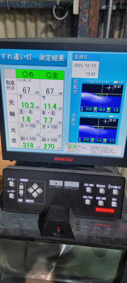 ヘッドライトの光軸をテスターで測定し、調整を行いました。
