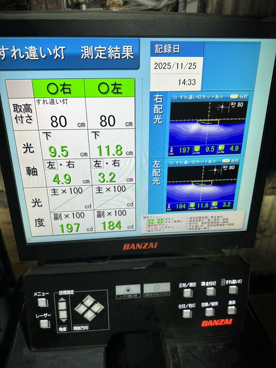 ヘッドライトの光軸をテスターで測定し、調整を行いました。