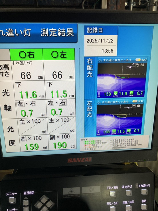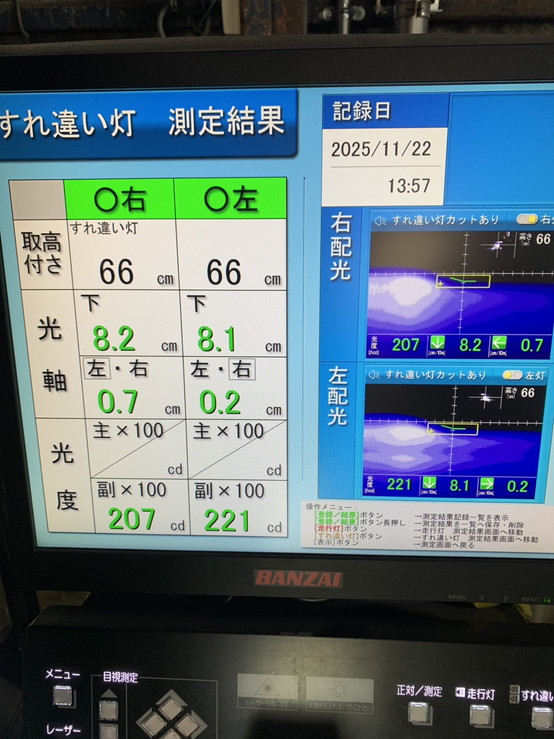 ヘッドライトの光軸をテスターで測定し、調整を行いました。