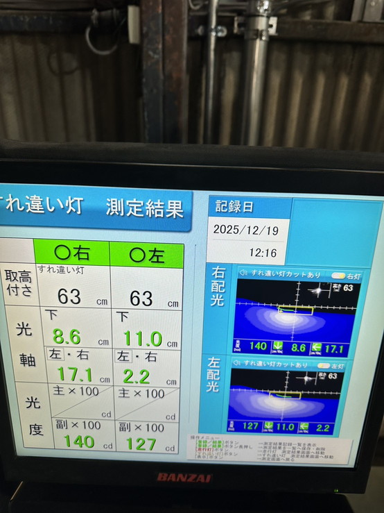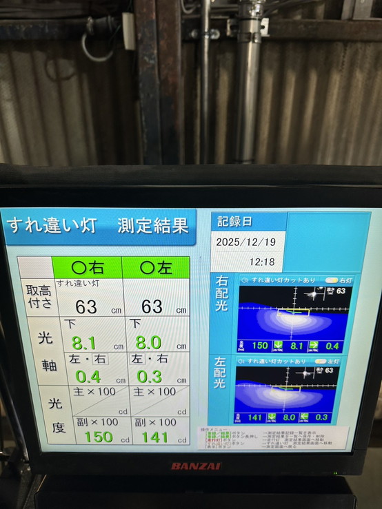 ヘッドライトの光軸をテスターで測定し、調整を行いました。