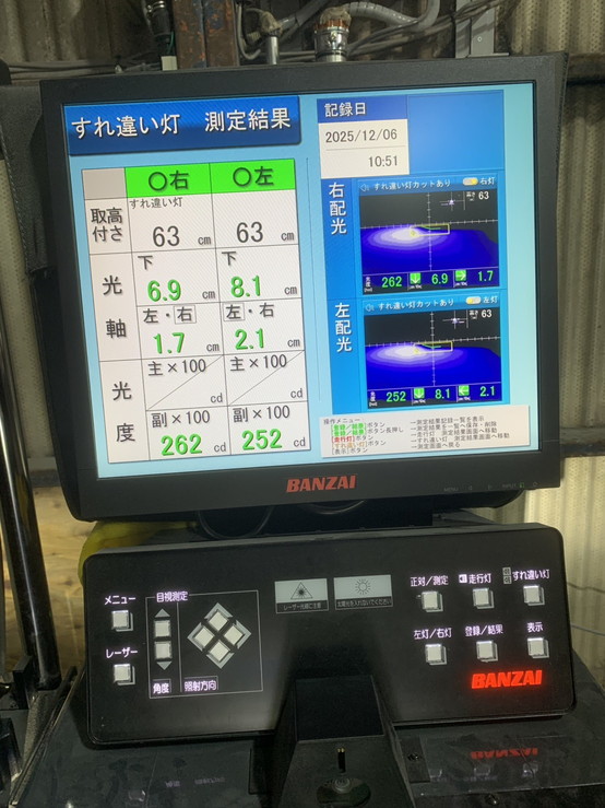 ヘッドライトの光軸をテスターで測定し、調整を行いました。
