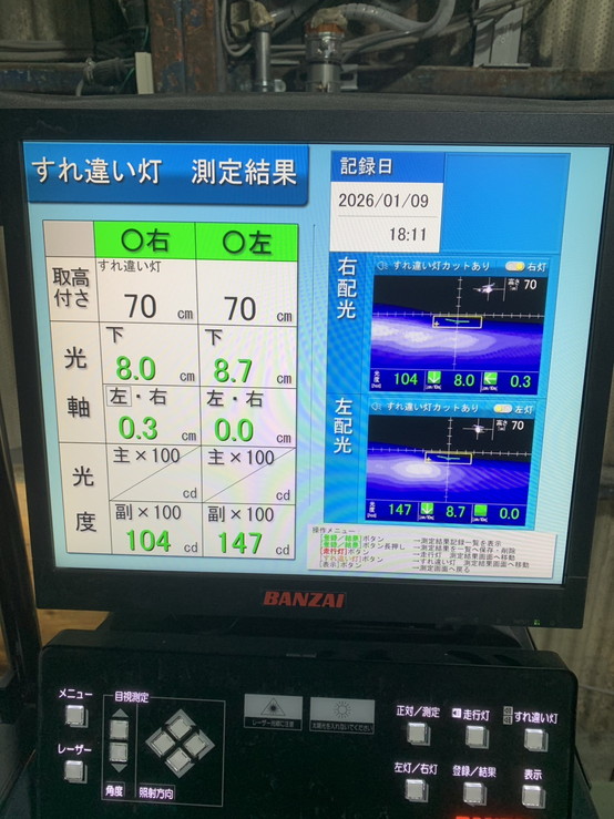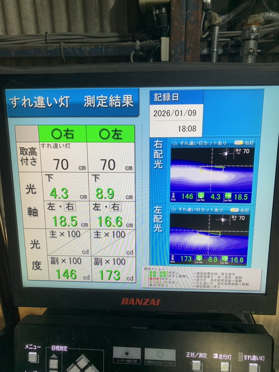 ヘッドライトの光軸をテスターで測定し、調整を行いました。