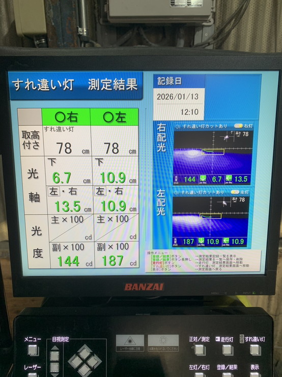ヘッドライトの光軸をテスターで測定し、調整を行いました。