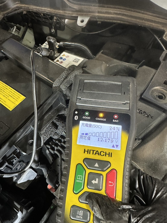 点検の際、バッテリーのテスター診断を行ったところ、充電量が24%という結果でした。