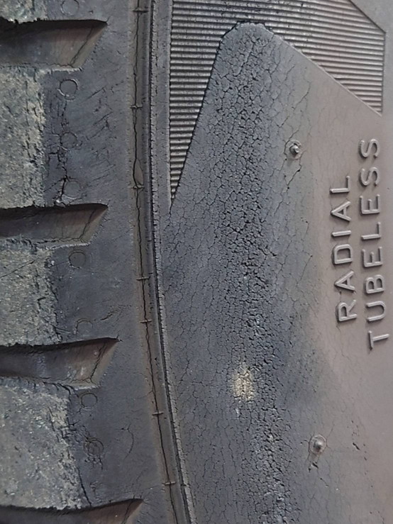 タイヤの点検を行ったところ、経年劣化によるヒビが目立つ状態でした。