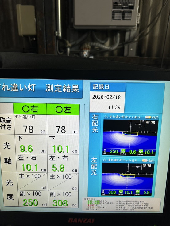 ヘッドライトの光軸をテスターで測定し、調整を行いました。