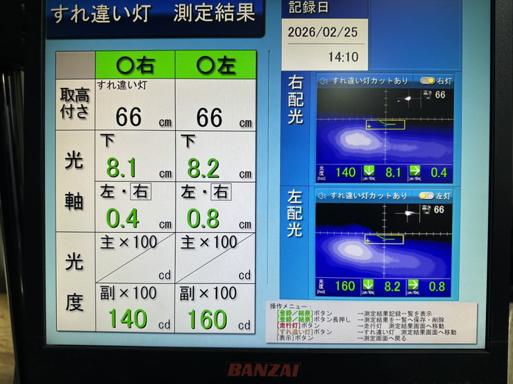 ヘッドライトの光軸をテスターで測定し、調整を行いました。