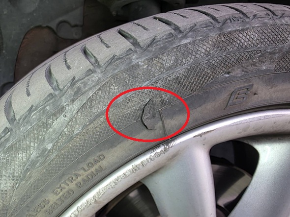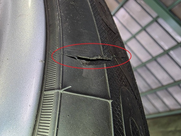 サイドウォールに裂けた跡がありましたのでタイヤ2本を交換致しました。