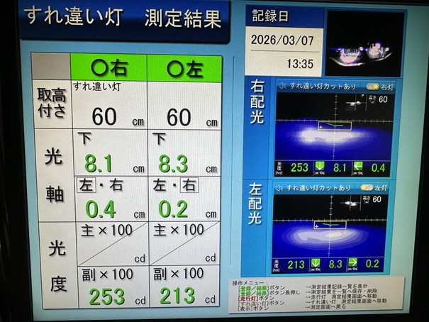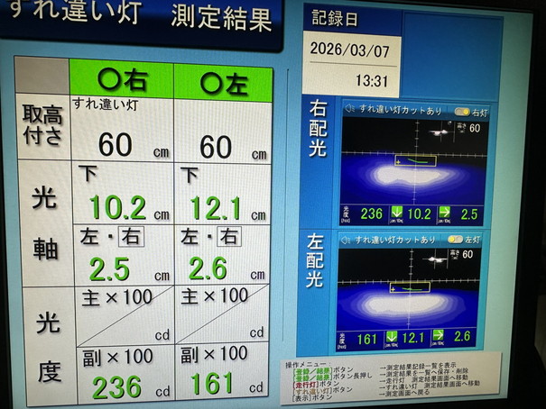 ヘッドライトの光軸をテスターで測定し、調整を行いました。