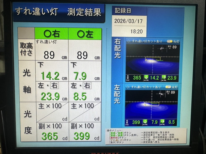 ヘッドライトの光軸をテスターで測定し、調整を行いました。