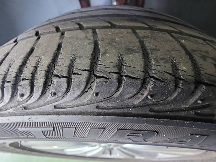 タイヤに亀裂や裂けめがありかなり危険な状態でしたので交換にてご案内を致しました。