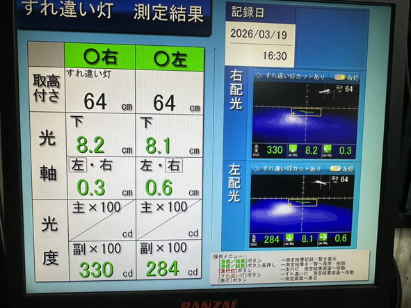 ヘッドライトの光軸をテスターで測定し、調整を行いました。