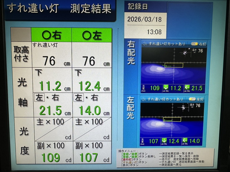 ヘッドライトの光軸をテスターで測定し、調整を行いました。