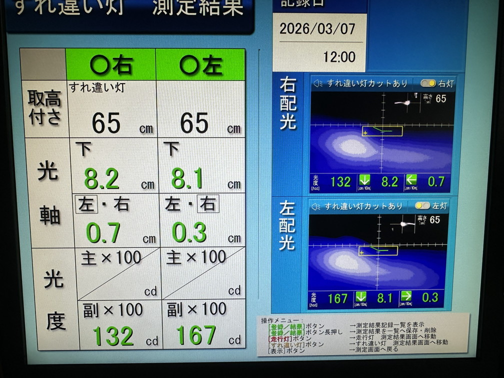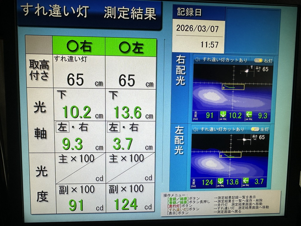 ヘッドライトの光軸をテスターで測定し、調整を行いました。