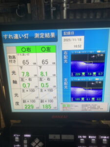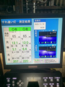 ヘッドライトの光軸をテスターで測定し、調整を行いました。