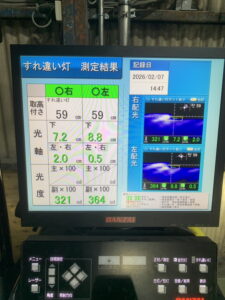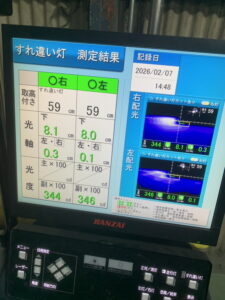 ヘッドライトの光軸をテスターで測定し、調整を行いました。