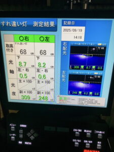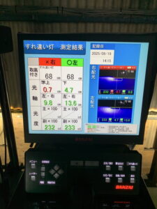 ヘッドライトの光軸をテスターで測定し、調整を行いました。