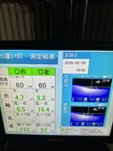 ヘッドライトの光軸をテスターで測定し、調整を行いました。