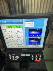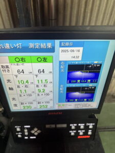 ヘッドライトの光軸をテスターで測定し、調整を行いました。