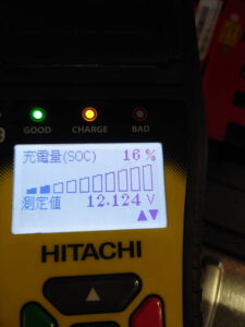 点検の際、バッテリーのテスター診断を行ったところ、充電量が16%という非常に低い数値でした。