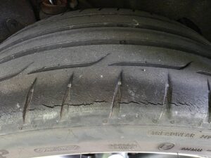 タイヤの点検を行ったところ、片べりとひび割れが確認され、一番摩耗が進んでいる箇所で1.6mm以下となっていました。