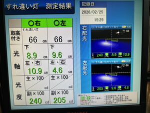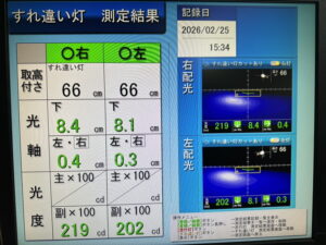 ヘッドライトの光軸をテスターで測定し、調整を行いました。