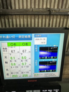 ヘッドライトの光軸をテスターで測定し、調整を行いました。
