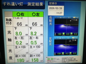 ヘッドライトの光軸をテスターで測定し、調整を行いました。