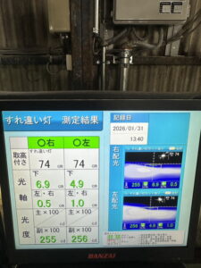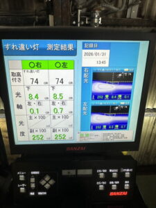 ヘッドライトの光軸をテスターで測定し、調整を行いました。