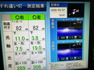 ヘッドライトの光軸をテスターで測定し、調整を行いました。