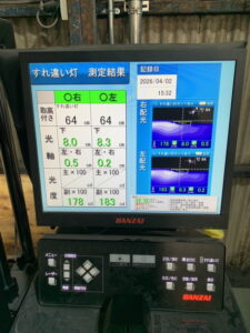 ヘッドライトの光軸をテスターで測定し、調整を行いました。