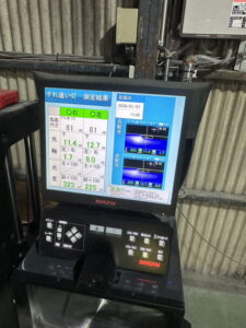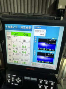 ヘッドライトの光軸をテスターで測定し、調整を行いました。