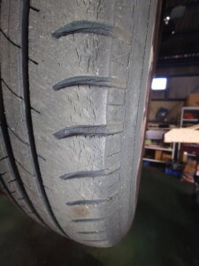 装着されていたタイヤは2018年製(約7年半経過)で、深刻な経年劣化により車検の保安基準に適合しない可能性が極めて高い状態でした。